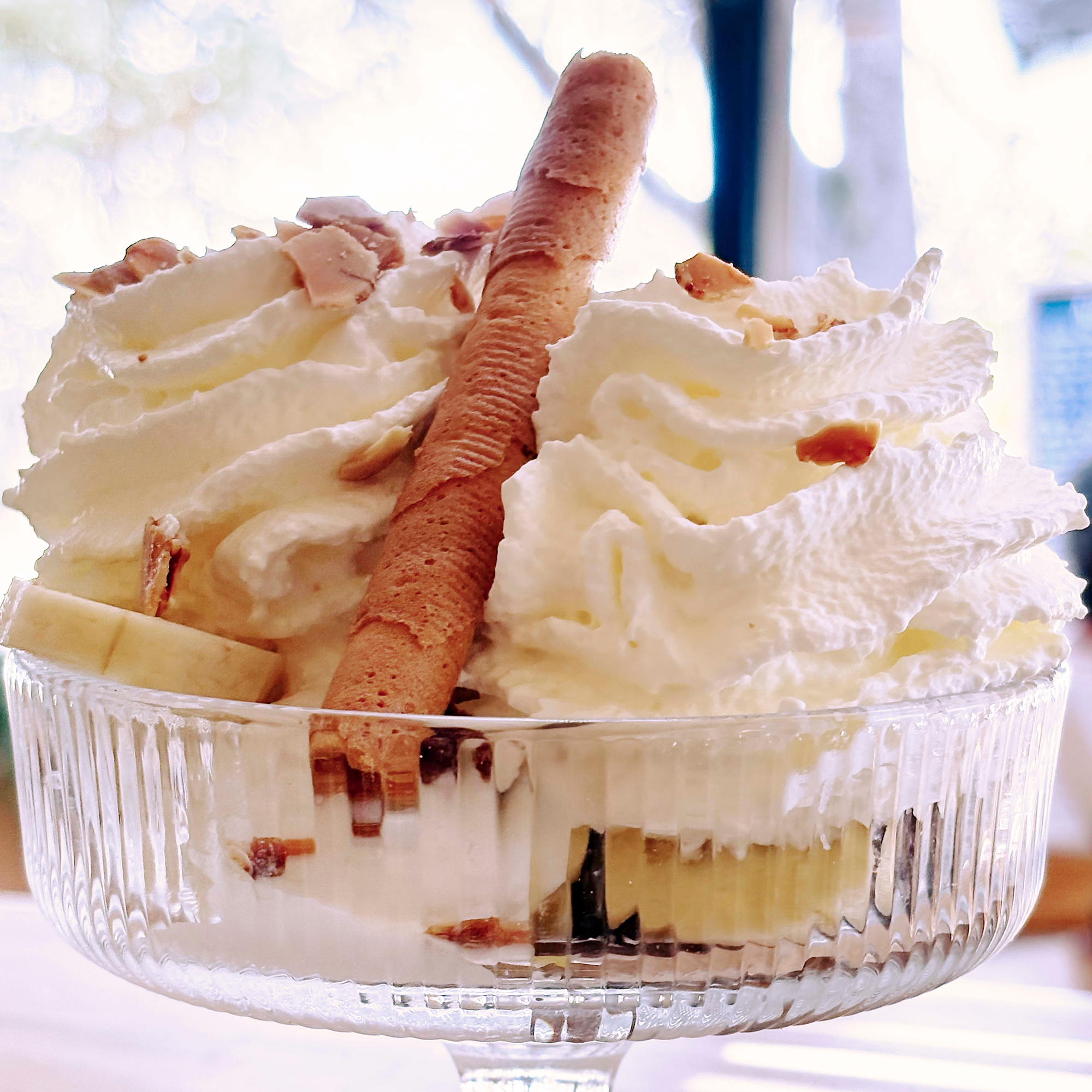 1 boule chocolat, 1 boule noix de coco, banane, Nutella, Chantlly, amandes caramélisées.